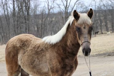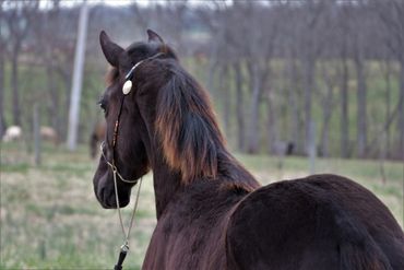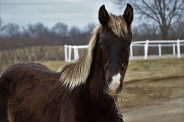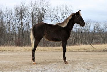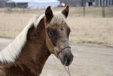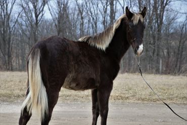The perfect chocolate with a light mane and tail contrast. This boy comes from a long line of great and I do mean great horses on both sides of his pedigree. I look for him to be super flashy with a very easy light gait, perfect for trail riding...IN STYLE. Should mature to 15.1-15.2 hand tall. Was a very curious more in your pocket type horse from the time he was born.